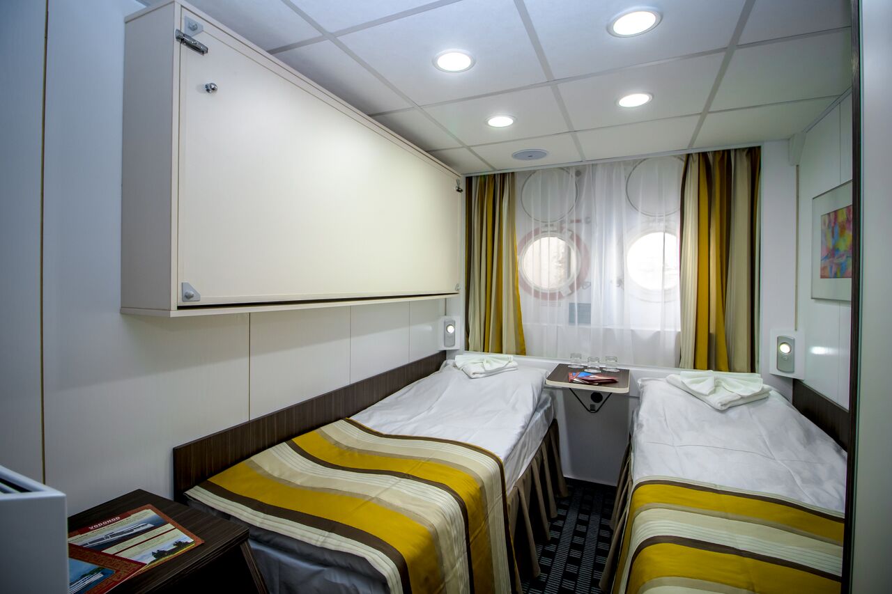 All standard cabins are the same regardless of the location and equipped with private facilities and a shower, wardrobe, radio, refrigerator and air conditioning. There is a large picture window in each cabin. Standard cabins are on a twin basis. If you prefer more comfort and space during your voyage please chose among our Junior Suite and Suite packages, or consider upgrading to a 4* or 5* ship.